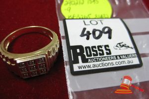 A STAMPED YELLOW GOLD, 9 DIAMOND SIGNET RING. TC 9 SINGLE CUT DIAMONDS OF 0.01CT EACH APPROX, CHECKER BOARD PATTERN SET VALUATION $120.00, 5.9 WEIGHT, 20.01 MM DIAM (IMS NO 290212 1545 11628/9) (KF3265)