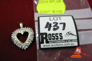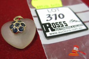 A STAMPED 14CT YELLOW GOLD, 7 BLUE SAPPHIRE HEART PENDANT. 7 ROUND FACETED SAPPHIRES OF 3.0MM DIAM, EACH APPROX IN A CENTRAL FLORAL DESIGN LAID ON THE TRANSLUCENT HEART SHAPED BASE, VALUATION $100.00, 4.2 WEIGHT (IMS NO 030912 1555 14412/38) (KF3280)