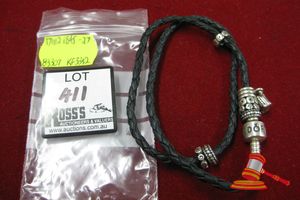 A PANDORA LEATHER NECKLET WITH 7 CHARMS AND 1 CLASP. VALUATION$ 100.00 14.0G WEIGHT (IMS NO 171112 1845 14531/27)