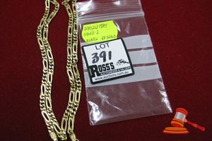 A STAMPED 9CT YELLOW GOLD, SIGNET RING. VALUATION $100.00 3.0G WEIGHT (IMS NO 040611 2200 1146/1) (KF3327) AND A STAMPED 9CT YELLOW GOLD, CHAIN AND ZODIAC PENDANT, BEVELLED CURB LINK, FIGARO STYLE OF 45CMS LONG INCLUDING BOLT RING VALUATION $240.00 8.0G WEIGHT (IMS NO 040611 2200 1146/2) (KF3326)