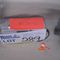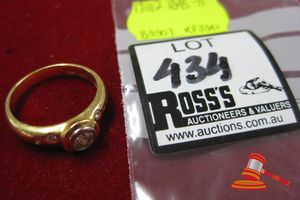 A STAMPED 18CT YELLOW GOLD 1 RED STONE AND 2 DIAMOND RING. 1 CENTRAL PEAR FACETED RED STONE = 6MM X 3.5MM AND 2 BRILLIANT CUT DIAMONDS = 0.01CT & 0.015CT EACH APPROX. VAULATION $320.00 7.6 WEIGHT, 18.74 MM DIAM (IMS NO 190711 0600 13725/26) (KF 3298)
