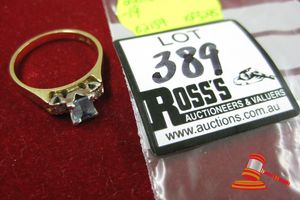 A STAMPED 18CT YELLOW GOLD, 1 BLUE STONE AND 2 DIAMOND RING. 1 EMERALD CUT BLUE STONE = 5.5MMX4.1MM DIAM AND 2 SINGLE CUT DIAMONDS OF 0.015CT EACH APPROX VALUATION $125.00, 3.7 WEIGHT, 17.4MM DIAM (IMS NO 221112 0130 14453/19) (KF3295)