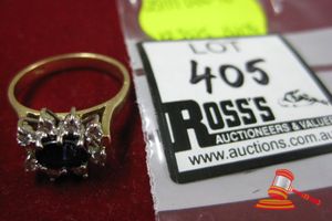 A HALLMARKED 9CT YELLOW GOLD, 12 BLUE SAPPHIRE AND 10 DIAMOND CLUSTER RING, 1 CENTRAL MARQUISE FACETED AND 11 ROUND FACETED SAPPHIRES SEPARATED BY 10 SINGLE CUT DIAMONDS ALL UPON THE SPILT SHOULDERED BAND VALUATION $100.00 2.9G WEIGHT (IMS NO 251111 0950 13347/22) (KF3320)