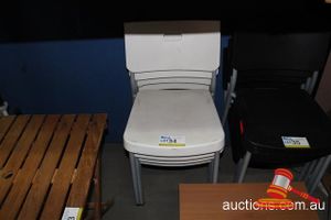 4 X WHITE PLASTIC STACKABLE CHAIRS WITH METAL FRAMES