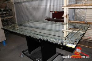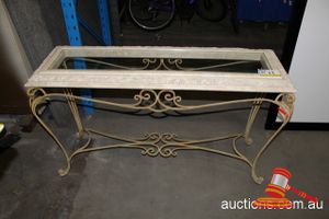 STONE LOOK GLASS INSERT HALL TABLE WROUGHT IRON LEGS 1270 X 410 X 740MM
