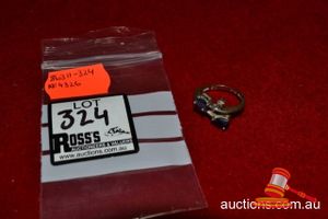 A HALLMARKED 18CT YELLOW GOLD, RED STONE SET RING. WITH 1 DOUBLET AND 2 SYNTHETIC RED STONES AND 1 X 1MM DIAMOND CHIP. CARVED HALF HOOP DESIGN. VALUATION $100.00 (KF4341) (IR-180610 1230 10957/223)