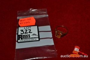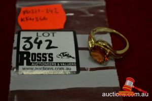 A HALLMARKED 9CT YELLOW GOLD, 1 SYNTHETIC YELLOW STONE RING WITH STONE MEASURING 10MM X 8MM DIAM. APPROX. ON BAND WITH FLARED AND TEXTURED SHOULDERS. VALUATION $100.00 TOTAL WEIGHT 2.20 (KF4342) (IR-180610 1230 10957/178)