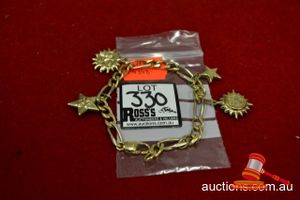 A STAMPED 18CT YELLOW GOLD, CHARM BRACELET. WITH 4 SUN AND MOON CHARMS ON A FIGARO STYLE BRACELET OF 18.5CMS LONG INCLUDING PARROT CLASP. VALUATION $600.00, TOTAL WEIGHT 19.60 (KF4348) (IR-180610 1230 10957/195)