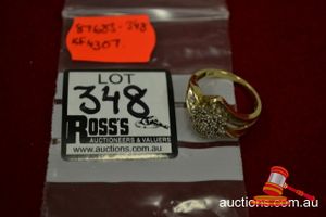 A STAMPED 18CT YELLOW GOLD, DIAMOND AND SAPPHIRE CLUSTER RING. WITH 1 CENTRAL BRILLIANT CUT DIAMOND OF 0.17CT APPROX., 8 ROUND FACETED SAPPHIRES OF 2.0MM DIAM. AND 7 SINGLE CUT DIAMONDS (PLUS ONE MISSING) OF 0.015CT EACH APPROX. STAR DESIGN TOP/HEAD, VALUATION $280.00 TOTAL WEIGHT 3.70 (KF4345) (IR-180610 1230 10957/174)
