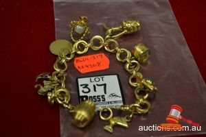 A STAMPED 18CT YELLOW GOLD, 9 CHARM BRACELET. ASSORTEDCHARMS UPON THE FANCY TEXTURED AND RIDGED ROPE LINK BRACELET OF 20CMS LONG INCLUDING BOLT RING. VALUATION $1200.00 TOTAL WEIGHT 37.40 (KF4368) (IR-180610 1230 10957/165)