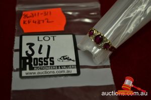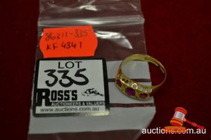 A STAMPED 9CT YELLOW GOLD, 3 SYNTHETIC RUBY AND 4 DIAMOND RING. WITH 4 SINGLE CUT DIAMOND OF 0.005CT EACH APPROX. SET IN PAIRS. SYNTHETIC RUBIES = 2 X ROUND AND 1 X OVAL.VALUATION $100.00 TOTAL WEIGHTS 1.20 (KF-4372) (IR-171012 0825 9871/19)