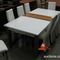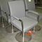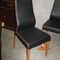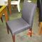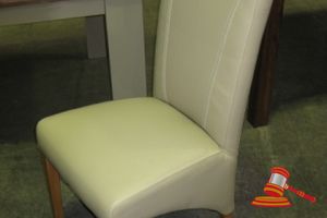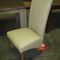 SET OF EIGHT PALE UPHOLSTERED LOW DINING CHAIRS WITH STAINLESS STEEL CAPPED CHESTNUT LEGS AND WHITE LEATHER/PU BACKS