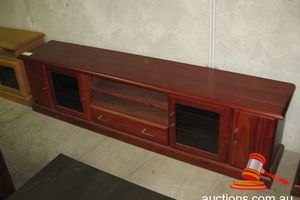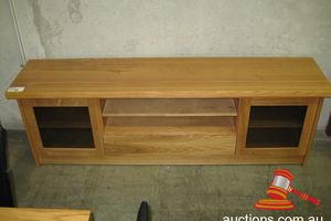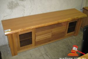 PIONEER JARRAH ENTERTAINMENT UNIT TWO GLASS FRONT DOORS AND THREE DRAWERS 1800 X 450MM