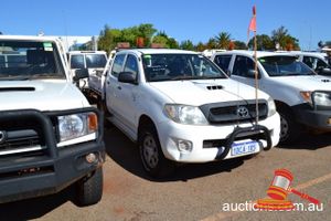 11/2008 TOYOTA HILUX SR DUAL CAB TRAY BACK WHITE 4X4 MANUAL PS AC D4D DIESEL NUDGE BAR TOOLBOX TOWBAR REG# 1DCA108 (LIC: 23/2/15) ODO 139,111 KMS SHOWING ENGINE# (1KD7715398) VIN# (MROFZ22G501022593) FLEET# (PP049) DISPOSAL# AA082 KEY# (51) (W)