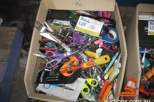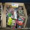 BOX OF ASSORTED LIGHTERS, POCKET KNIVES, CUTLERY, TAPE & SCISSORS (NO INSPECTION OF THIS ITEM)