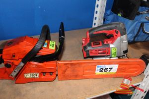SMALL ORNAGE TANAKA CHAINSAW, MODEL ECV-3801; RED MILWAUKEE JIGSAW C07AD13441277 (211114 1650 12361/0001; 071214 0630 13813/0025)