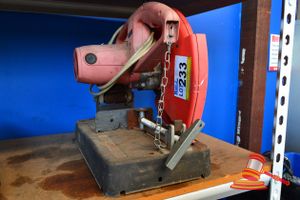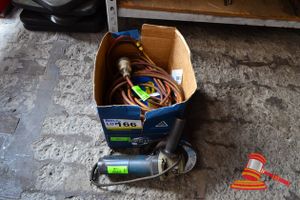 YELLOW & RED POWER EXTENSION CORD; ANGLE GRINDER WITH GRINDING WHEEL 51M-FF-1A; BLUE MAXUS STRAPS 2500KG, LARGE CHAIN WITH LOCK (170716 2000 11774/0001, 0002; 090616 0950 13970/0015, 0049)