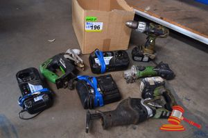 RYOBI ANGLE GRINDER CAG1800; RYOBI CORDLESS DRILL BIW180; RYOBI DRILL BATTERY CHARGER BCL14181H; RYOBI SMALL CORDLESS DRILL RID1801; RYOBI LARGE CORDLESS DRILL CIDD18V2; RYOBI LITHIUM 18V BATTERY PACK RB18L40; RYOBI LITHIUM 18V SMALL BATTERY PACK BPL-1815; RYOBIE LITHIUM 18V SMALL BATTER PACK RB18L15 (090616 0950 143970/0025, 0026, 0027, 0058, 0059, 0060, 0061, 0062)