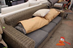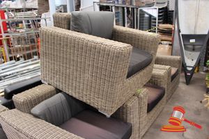 CANE OUTDOOR TABLE NO GLASS TOP, 2 X SINGLE CANE OUTDOOR CHAIRS, CUSHIONS (IR - 070616 1228 14262/0115, 0124, 0192, 0244)
