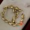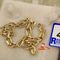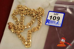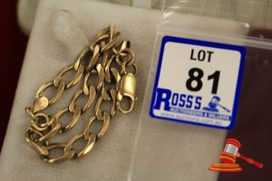 A TESTED YELLOW GOLD, CHAIN BRACELET WITH BELL CHARM. LINK OF BOX STYLE WHICH MEASURES 18CMS INCLUDING 'S' HOOK CLASP & WEIGHS 3.4GRAMS $155 KF7926 (IR - 130616 2004 83916/0021)