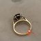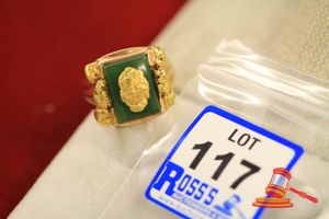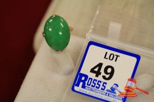 A STAMPED 14CT YELLOW GOLD, 1 DYED GREEN STONE RING WITH 1 OVAL CABOCHON OF 19.9MM X 14.3MM DIAM. APPROX., CLAW SET UPON A FLORAL BASKET & WHICH WEIGHS 5.7GRAMS. $120 KF7909 (IR - 150916 1520 15866/0031)