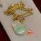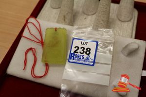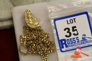 A TESTED YELLOW GOLD, TREATED JADE PENDANT & CHAIN NECKLET. THE PENDANT CONTAINS ONE CARVED JADE PIECE, TREATED & THE CHAIN OF THICK ANCHOR LINK MEASURES 49CMS LONG INCLUDING 'S' HOOK CLASP. TOTAL WEIGHT OF 25.0GRAMS. $900 KF7924 (IR - 130616 2004 83916/0018)