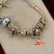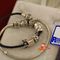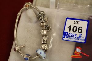 A SILVER PANDORA DOUBLE BRACELET WITH HALF SILVER CHAIN & HALF LEATHER WITH 6 ASSORTED CHARMS & 1 X DOUBLE SAFETY CHAIN & WEIGHS 39.5GRAMS.(VALUATION $100.00) (KF - 7813) (IR - 201116 1145 11550/1)