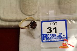 A STAMPED 9CT YELLOW GOLD, 1 GARNET & 4 DIAMOND RING WITH 1 OVAL FACETED GARNET OF 10MM X 8MM DIAM. APPROX. & IS 4CLAW SET & 4 ROUND BRILLIANT CUT DIAMONDs OF 0.02CT EACH APPROX.. ALL SET UPON ROUNDED PARKANE BAND & WEIGHS 3.3GRAMS. $350 KF7911 (IR - 050916 1230 88034/0001)