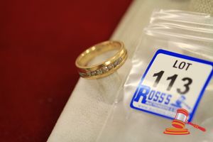 A STAMPED 18CT YELLOW GOLD, 20 DIAMOND SET BAND RING WITH 20 ROUND BRILLIANT CUT DIAMONDS OF 0.015CT EACH AVER. & ARE RUB OVER SET IN A ZIG ZAG PATTERN CONTINUOUSLY OVER THE CENTRAL LOWERED SECTION & WHICH WEIGHS 9.4GRAMS.(VALUATION $600.00) (KF - 7823) (IR - 131115 0750 12917/66)