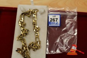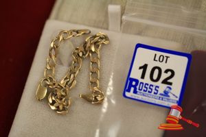 A STAMPED 9CT YELLOW GOLD, CHAIN BRACELET. GATE LINK WITH 'TIGER' INSERTS WHICH MEASURES 20CMS LONG INCLUDING SLIDE BOX CLASP WITH 1 X 8BALL CLIP & WHICH WEIGHS 17.2GRAMS.(VALUATION $260.00) (KF - 7838) (IR - 300416 0250 14674/7)