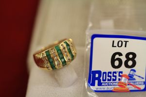 A STAMPED 18CT YELLOW GOLD, EMERALD & DIAMOND DRESS RING WITH 15 SQUARE FACETED EMERALDS OF 0.05CT EACH APPROX. & 20 ROUND BRILLIANT CUT DIAMONDS OF 0.015CT EACH APPROX. & ALL ARE SET IN PARALLEL & ALTERNATING GROUPD OF FIVE EACH & WHICH WEIGHS 8.7GRAMS.(VALUATION $700.00) (KF-7821) (IR - 131115 0750 12917/61)