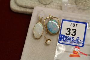 3 ITEMS. 1 = A STAMPED 9CT YELLOW GOLD, SOLID WHITE OPAL PENDANT OF 7.50CT APPROX., CROWN BEZEL CHENIER SET & WEIGHS 3.4GRAMS. 1 = A STAMPED 9CT YELLOW GOLD, DOUBLET BLACK OPAL PENDANT, CRACKED IN WIRE DESIGN & WEIGHS 3.5GRAMS. 1 = A PEARL STUD EARING WEIGHING 0.4GRAMS. $300 KF7904 (IR - 021116 1305 84173/0011)