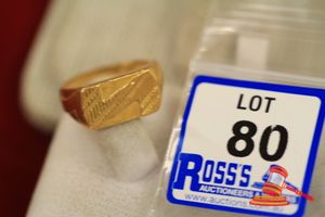 A STAMPED 22CT YELLOW GOLD, SIGNET RING WITH PART TEXTURED & FLAT TOP/HEAD & WHICH WEIGHS 7.9GRAMS (VALUATION $250.00) (KF - 7849) (IR - 150513 1549 11464/49)