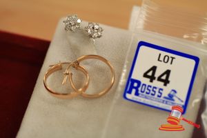 2 ITEMS. 1 = A PAIR STAMPED 18CT WHITE GOLD, 8 DIAMOND CLUSTER STUD EARRINGS WITH TOTAL OF 16 ANTIQUE CUT DIAMONDS OF BETWEEN 0.06CT - 0.10CT EACH APPROX. & WHICH WEIGHS 3.2GRAMS. 1 = A PAIR STAMPED 9CT YELLOW GOLD, HOOP EARRINGS WHICH WEIGH 1.4GRAMS. $900 KF7907C (IR - 251116 1010 89102/0004)