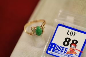 A STAMPED 14CT YELLOW GOLD, 1 TREATED JADE & 6 DIAMOND RING WITH 1 OVAL CABOCHON TREATED JADE OF 8.6MM X 6.1MM DIAM. APPROX. & 6 Single cut DIAMONDS OF 0.015CT EACH APPROX., SET THREE EACH SHOULDER. WEIGHT 3.5GRAMS (VALUATION $100.00) (KF - 7844) (IR - 170216 2345 11259/1)