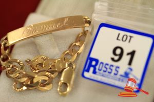A STAMPED 9CT YELLOW GOLD, IDENTITY BRACELET OF BEVELLED CURB LINK WITH A CENTRAL CURVED FLAT SECTION & WHICH WEIGHS 14.9GRAMS.(VALUATION $230.00) (KF - 7830) (IR - 070814 0545 10773/73)
