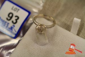 A STAMPED 18CT WHITE GOLD, 1 COLOURLESS STONE & 50 DIAMOND RING WITH TWO STONES MISSING,WITH 1 CENTRAL COLOURLESS STONE OF A BRILLIANT CUT WHICH MEASURES 8.0MM DIAM. APPROX. & IS 6CLAW SET & 50 SHOULDER SET & WHICH WOULD WEIGH BETWEEN 0.015CT - 0.005CT EACH APPROX. BEAD SET IN SETTING AND SHOULDERS AND WEIGHS 5.0GRAMS. BAND STAMPED STEFAN (VALUATION $200.00) (KF - 7851) (IR - 270914 2315 14832/16)