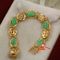 A TESTED YELLOW GOLD, GREEN STONE SET BRACELET, ASIAN DESIGN WITH 5 OVAL CABOCHON TREATED GREEN STONES, SEPARATED BY CIRCULAR LINKS & WHICH MEASURES 18CMS LONG WITH LADDER CLASP & WHICH WEIGHS 14.7GRAMS. $450 KF7905 (IR - 221216 2007 15587/0001)