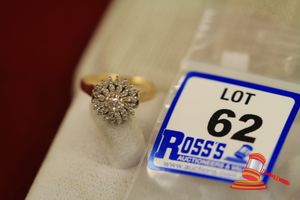 A STAMPED 18CT YELLOW GOLD, 31 DIAMOND CLUSTER RING WITH 1 CENTRAL ROUND BRILLIANT CUT DIAMOND OF 0.14CT APPROX. & IS SURROUNDED BY 30 BRILLIANT DIAMONDS OF 0.015CT EACH APPROX. & ARE CLAW SET IN TWO STEPPED ROWS & WHICH WEIGHS 3.6GRAMS. (VALUATION $600.00) (KF - 7815) (IR - 311016 1430 15016/1)