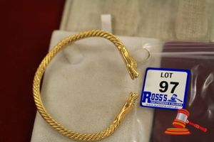 A TESTED YELLOW GOLD, BANGLE, DOUBLE HEADED SNAKE DESIGN, OPEN & FLEXIBLE & WHICH WEIGHS 56.5GRAMS.(VALUATION $1750.00) (KF-7817) (IR - 131115 0750 12917/43)