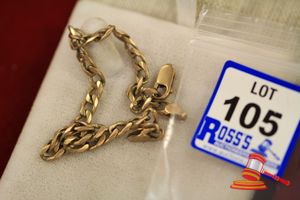 A STAMPED 9CT YELLOW GOLD, FANCY CHAIN BRACELET. GATE LINK STYLE WHICH MEASURES 23CMS INCLUDING PARROT CLASP & PADLOCK & WHICH WEIGHS 19.3GRAMS. (VALUATION $300.00) (KF - 7835) (IR - 041016 1300 16203/13)