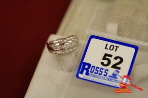 A STAMPED 10K YELLOW GOLD 48 DIAMOND RING WITH 6 CENTRAL PRINCESS CUT DIAMONDS OF 0.10CT EACH APPROX. & 26 OUTER ROUND BRILLIANT CUT DIAMONDS OF 0.015CT EACH APPROX. & 16 INNER TAPERED BAGUETTE DIAMONDS OF BETWEEN 2.2MM - 1.8MM LONG EACH APPROX. & ARE SET IN A TRIPLE BAND DESIGN AND WEIGHS 5.2GRAMS. (VALUATION $600.00) (KF7804) (IR- 040915 1609 88655/9)