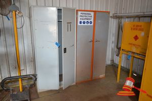 WHITE 20' SEA CONTAINER WITH LIGHTING SHELVING & PPE; REAR DOOR & SIDE DOOR 30LTR DANGEROUS GOODS CABINET AND 2 X BOSCOTEK CABINETS (A/N 12)