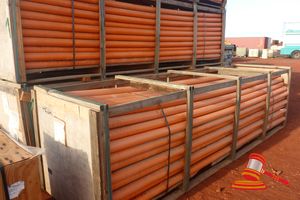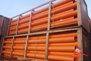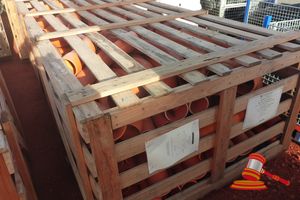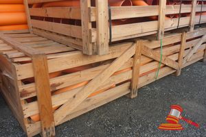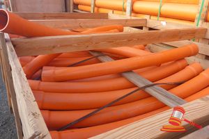40+ crates containing electrical conduit rigid pipe and bends, sizes range from 32mm, 50mm, 80mm, 100mm, 125mm & 150mm. HDPE pipe, bends and couplings, sizes ranging 110mm 180mm, 250mm & 400mm
