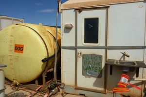 QTY OF PORTABLE TOILET/SHOWER BUILDING WITH 5000LT TANK AND PUMPING FACILITIES (SLED MOUNTED) (MP77#5764)