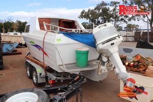 HALF CABIN CRUISER ID# AU-TWA 001976 APPROX 18 TO 20 FOOT FIBREGLASS, BIMI COVER, ASSORTED PARTS, JOHNSON V4 130 HP OUTBOARD MOTOR (TO BE SOLD WITH LOT 90)