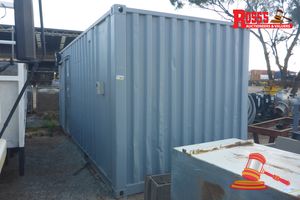 20FT CONTAINER FITTED OUT AS A HOSE ROOM INCLUDING SIDE DOOR, WIRED WITH 15AMP POWER POINTS - WIRED FOR LIGHTING INTERNAL FUSE BOX - 6 X ROWS 10' APPROX PLASTIC TOTE STORAGE BOXES WITH VARIOUS HOSE FITTINGS - STEEL WORKBENCH WITH UNDER STORAGE FOR SPIRAL CASING - ELECTRIC HOSE CUTOFF SAW - WALL MOUNTED GREASE AND AIR REELS - WHIRLY BIRD VENTILATION PARKER - HOSE PRESS - ENGINEERS VICE