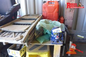 QTY OF VARIOUS ITEMS INCLUDING SUMITON FORKLIFT TYRE 6.50-10- OXY GAUGES - POST HOLE RAMMER - TOYOTA JACK - U BOLTS