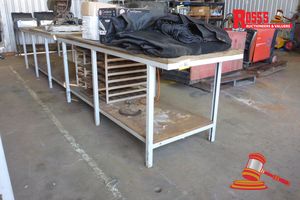 LARGE BENCH 5.3m LONG WITH VICE & SHELVES & 1 X GPO