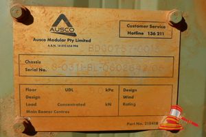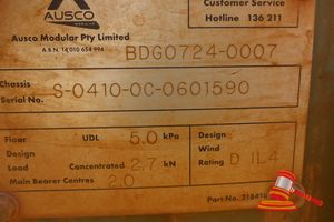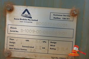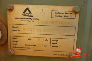 6 X MODULE TRANSPORTABLE BUILDING OFFICE/ CRIB, AUSCO, 03/2011, 5 X MODULES 14.6M X 3.33M X 3.25M, 1 X MODULE 7.2M X 3.35M X 3.1M. CONTAINS SEPARATED OFFICES, BUILT IN CUPBOARDS, SINK FACILITIES, COMPUTER AND ALARM CONTROL MONITORING SYSTEMS. S/N S-0411-BL-0602787/01 - S-0411-BL-0602787/06, BDG0757-0004. (SD0435, ITEM 27489)